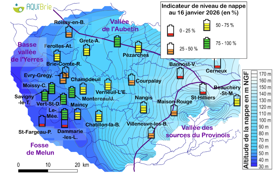 Au 16 janvier, les niveaux de la nappe restent bien au-dessus des seuils de vigilance, tant à Montereau/Jard (+2,6 m) qu’à Beauchery-Saint-Martin (+6,3 m). Il faut toutefois espérer que les pluies soient abondantes dans les prochaines semaines pour que la recharge puisse enfin démarrer et que les niveaux remontent suffisamment pour écarter tout risque de passage sous le seuil de vigilance à l’est d’ici la fin de l’été.