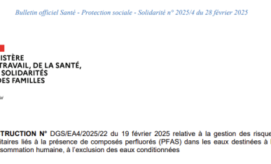 Saisi par la Direction générale de la santé, le Haut Conseil de la santé publique (HCSP) recommande l’intégration d’une valeur sanitaire cible pour les PFAS les plus préoccupants. Des travaux sont encore en cours à l’ANSES (Agence Nationale de Sécurité Sanitaire de l’alimentation, de l’environnement et du travail) afin de définir des valeurs sanitaires maximales et d’adapter les modalités de gestion.