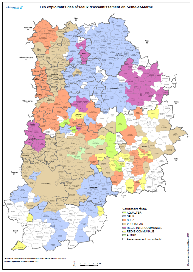 20 communes (situées sur la frange Ouest), représentant un peu plus de 21% de la population Seine-et-Marnaise, ont leurs eaux usées traitées à l'extérieur du département.