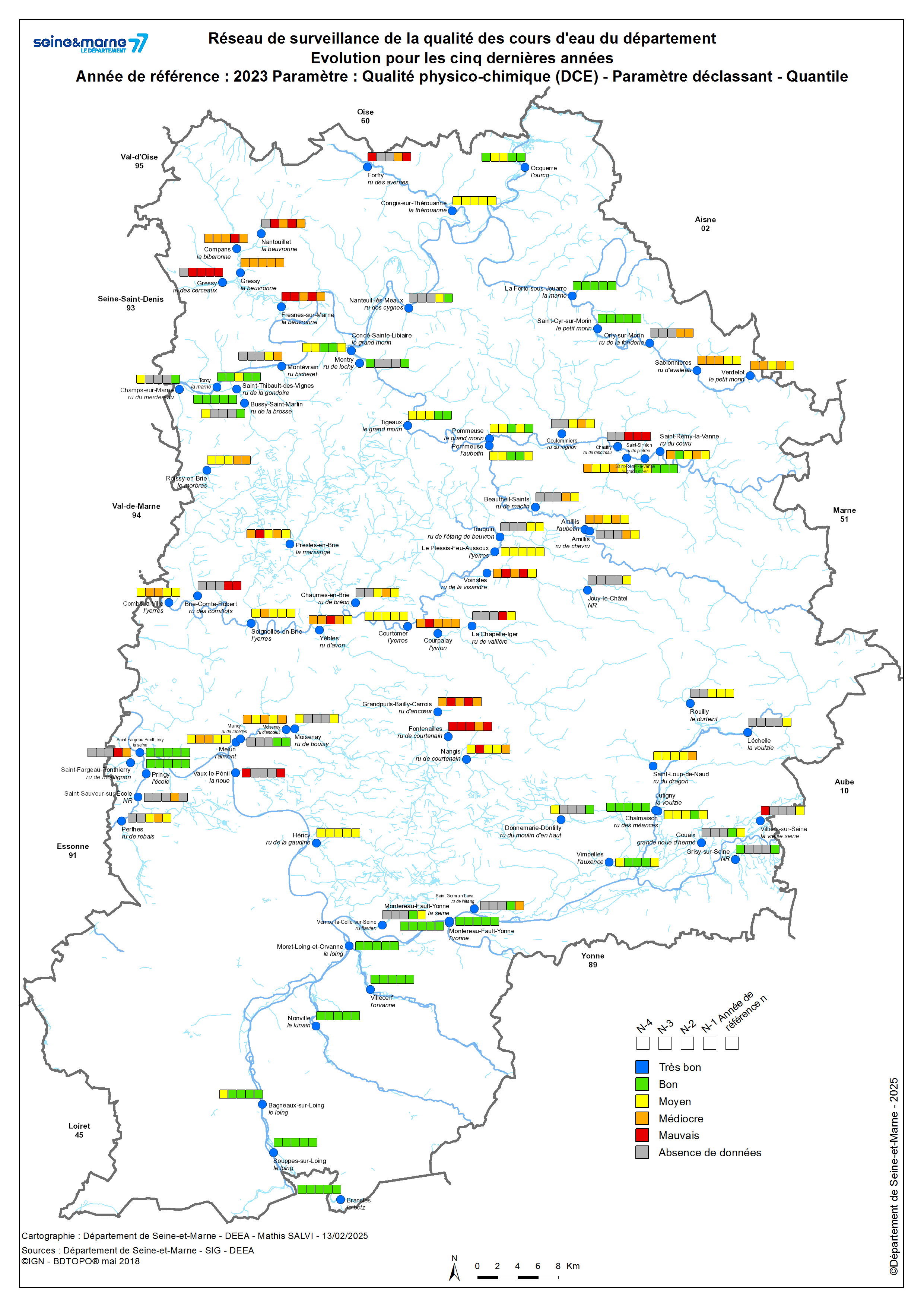 Les grands cours d’eau du département suivants présentent une bonne qualité physico-chimique : Seine, Marne, Loing et l'Yonne. Les secteurs Nord-Ouest et la partie centrale du département souffrent en revanche d’une qualité physico-chimique des eaux superficielles médiocre à mauvaise en raison notamment d’un potentiel hydromorphologique limité, de débits très faibles à l’étiage et donc d’une faible capacité d’autoépuration.
