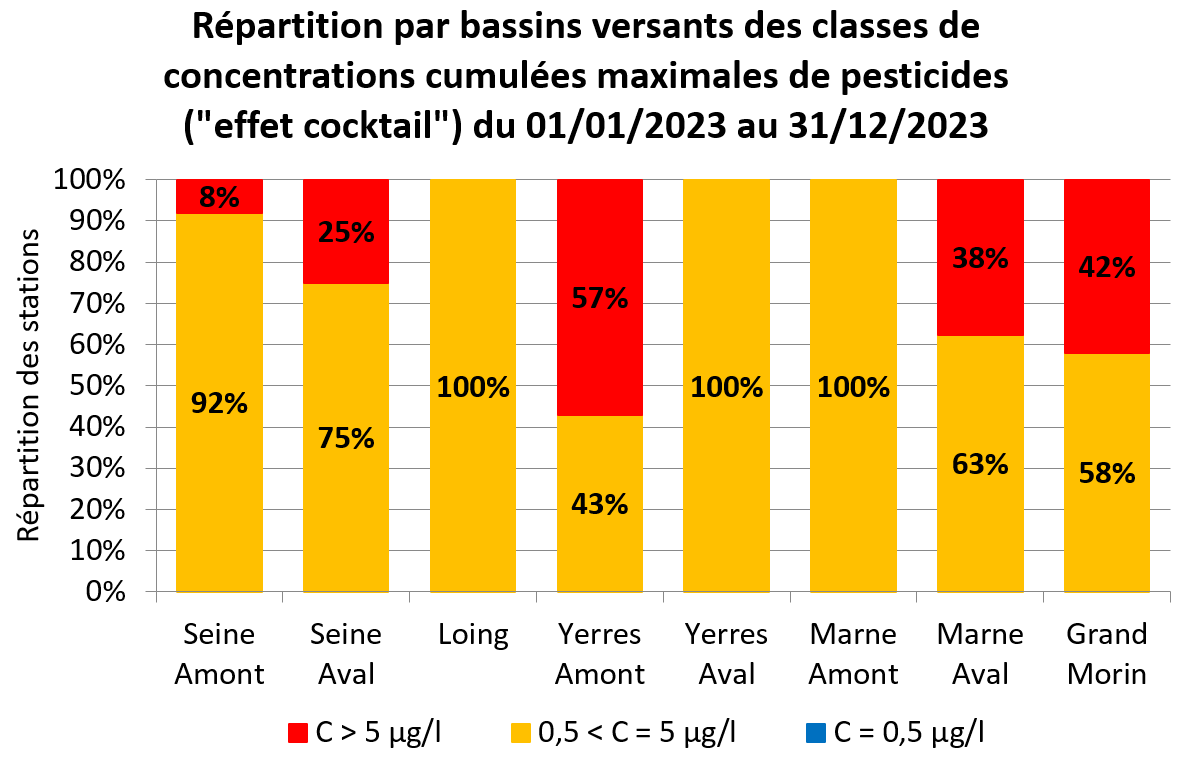 En termes de concentrations, le constat reste préoccupant en 2023 sur la majorité des bassins versants dans la mesure où, ponctuellement dans l’année, la teneur en pesticides dans certains cours d’eau dépasse les limites autorisant un traitement de potabilisation (5 μg/l). Le niveau de contamination est donc significatif et diffus.